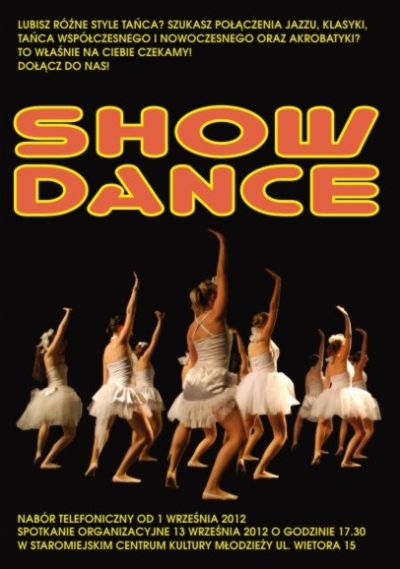 ZAJĘCIA SHOW DANCE to forma stałych zajęć tanecznych prowadzonych w Staromiejskim Centrum Kultury Młodzieży. Zajęcia odbywajš się w grupach wiekowych z uwzględnieniem stopnia trudnoœci i zaawansowania grupy. W trakcie naszych zajęć kształcimy pozytywnš postawę wobec tańca, jako formy artystycznego wyrażania siebie. Uczymy podstaw różnych technik tanecznych: tańca współczesnego, tańca klasycznego, tańca nowoczesnego, modern, jazz. Poznajemy podstawowe elementy akrobatyki. Kształcimy pamięć ruchowš poprzez tworzenie układów tanecznych. Uczestniczšc w zajęciach tanecznych bierzemy udział w pokazach, konkursach oraz warsztatach tanecznych.