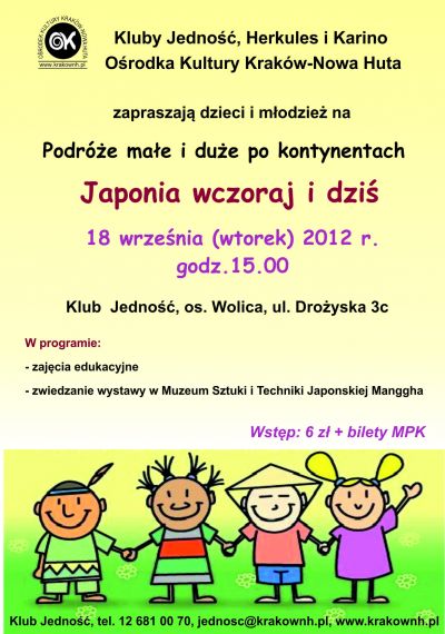 Klub Jednoć Orodka Kultury Kraków-Nowa Huta (ul. Drożyska 3c) zaprasza na zajęcia Japonia wczoraj i dzi, które odbędš się 18 wrzenia 2012 r. (wtorek) o godz. 15.00.