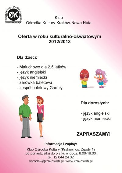 W roku kulturalno-owiatowym 2012/2013 Klub Orodka Kultury Kraków-Nowa Huta serdecznie zaprasza dzieci i dorosłych do udziału w różnorodnych zajęciach.