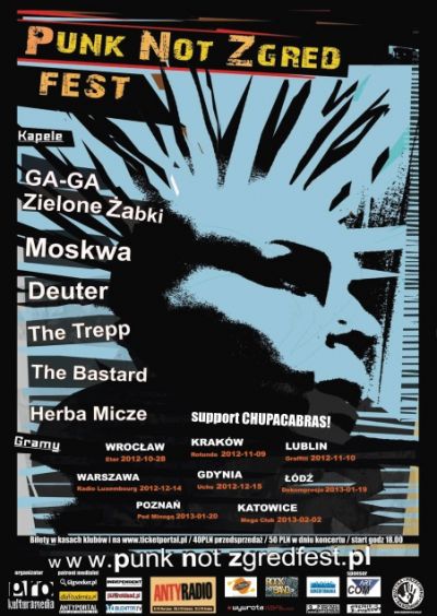 Punk Not Zgred to jedyny objazdowy festiwal punkowy w tym kraju! Mamy dla Was prawdziw petard brzmie, zagraj legendy sceny punkowej Deuter, Moskwa, The Trepp,obchodzcy jubileusz 25 lecia na scenie GAGA Zielone abki wspomagani dzielnie przez doskonae zespoy modego pokolenia mocny i nieokieznany na scenie The Bastard oraz wietny regaowy skad z Lublina Herba Micze, ktry rozkrci atmosfer naszych koncertw.