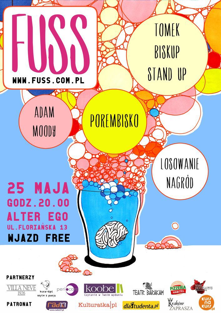 Do imprezy zagrzewać Was będzie Adam Moody, śpiewem przeniesie na wschód Porembisko, a Tomek Biskup zabawi gadaniem, czyli jedynym w swoim rodzaju stand up comedy show. Ponadto, będziecie mogli pogadać z gronem twórców, obejrzeć pokazy ilustracji i grafik, posłuchać muzyki z szafy grającej i napić się niedrogiego piwa. A równo o północy wielka FUSSowa fiesta na cześć naszych czytelników – losowanie nagród, z weekendem dla dwóch osób w Villa Neve w Ustrzykach Dolnych na czele!