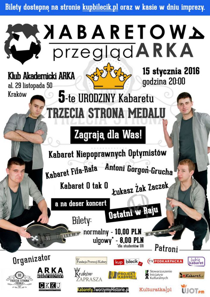 Trzecia w tym sezonie, zarazem pierwsza w nowym roku edycja Kabaretowej PrzeglądARKI niezmiennie w Klubie Akademickim ARKA al. 29 Listopada 50 o godzinie 20:00!