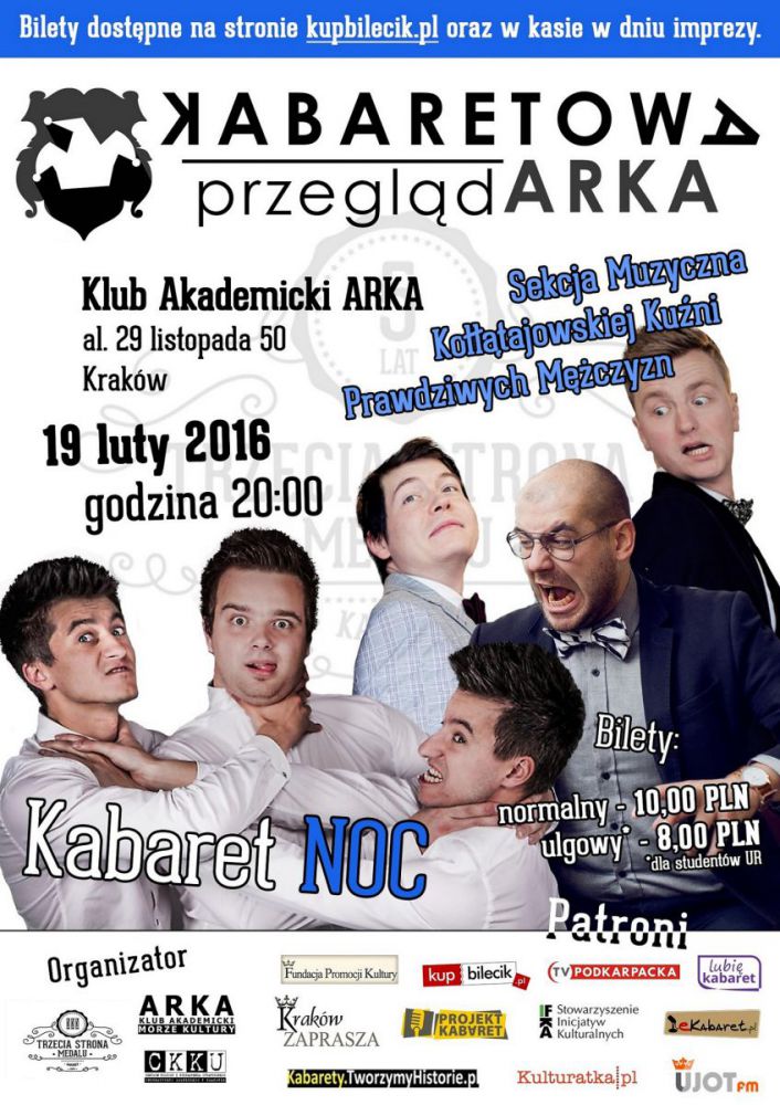 Czwarta w tym sezonie, a zarazem szósta ogółem, edycja Kabaretowej PrzeglądARKI niezmiennie w Klubie Akademickim ARKA al. 29 Listopada 50 o godzinie 20:00!