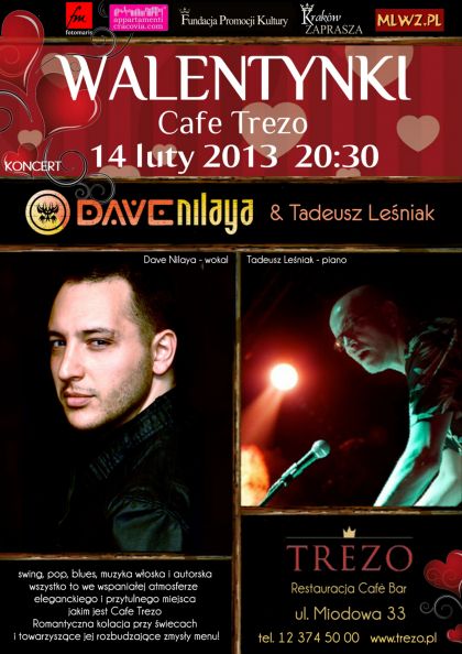 Cafe Trezo zaprasza na wieczór walentynkowy z koncertem włosko-polskiego duetu Dave Nilaya - wokal & Tadeusz Leśniak - piano.
