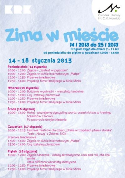 Od 14 do 25 stycznia (podczas ferii zimowych) zapraszamy na zajęcia dzieci w wieku 7-11 lat. Zajęcia odbywać się będą od poniedziałku do piątku w godzinach 10.00 - 14.00 w Ośrodku Kultury im. C. K. Norwida os. Górali 5.