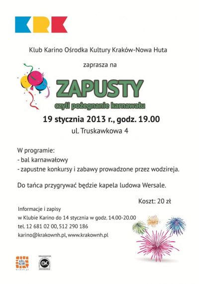 Klub Karino Ośrodka Kultury Kraków-Nowa Huta (ul. Truskawkowa 4) zaprasza na zapusty.