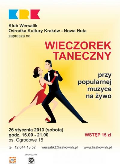 Klub Wersalik Ośrodka Kultury Kraków-Nowa Huta (os. Ogrodowe 15) zaprasza 26 stycznia 2013 r. w godz. 16.00-21.00 na bezalkoholowy wieczorek taneczny przy popularnej muzyce na żywo.