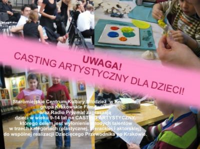 Staromiejskie Centrum Kultury Młodzież w Krakowie, grupa Krakowskie Filmowisko oraz Radio Pryzmat zapraszają dzieci w wieku 9-14 lat na CASTING ARTYSTYCZNY, którego celem jest wyłonienie młodych talentów w trzech kategoriach (plastycznej, literackiej i aktorskiej) do wspólnej realizacji Dziecięcego Przewodnika po Krakowie.