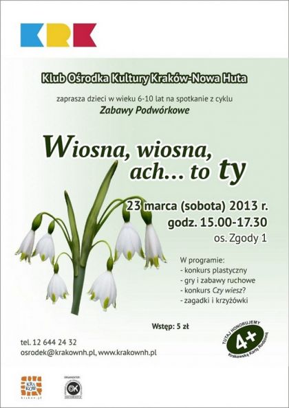 Dzieci w wieku 6-10 lat zapraszamy na spotkanie z cyklu Zabawy podwórkowe. W programie imprezy w Klubie Ośrodka Kultury Kraków-Nowa Huta m.in.: konkurs plastyczny, gry i zabawy ruchowe, konkurs Czy wiesz?, zagadki i krzyżówki. Z pewnością każdy znajdzie coś dla siebie.