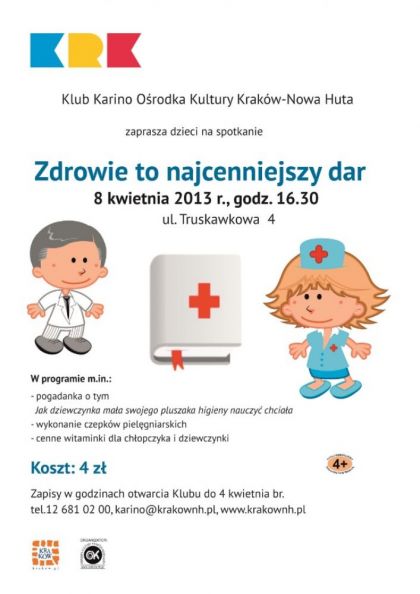 Zapraszamy dzieci do Klubu Karino Ośrodka Kultury Kraków-Nowa Huta (ul. Truskawkowa 4) na spotkanie z okazji Dnia Pracownika Służby Zdrowia, które odbędzie się 8 kwietnia br. o godz. 16.30.