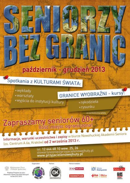 Projekt Seniorzy bez granic realizowany będzie od października do grudnia 2013 r. poprzez organizację atrakcyjnych zajęć edukacyjnych i artystycznych. Na cykl Spotkań z kulturami świata składać się będą wykłady podróżników, wieczory kulturowe, wizyty w instytucjach kultury, warsztaty biżuterii, kaligrafii japońskiej i tańca. Seniorzy będą mogli także uczestniczyć w dwóch kursach rozwijających ich umiejętności artystyczne. W ramach cyklu Granice wyobraźni odbędzie się bowiem kurs rękodzieła oraz rysunku.