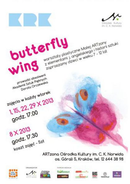Butterfly Wing to warsztaty plastyczne z elementami języka angielskiego oraz historii sztuki, dla dzieci w wieku od 7 do 12 lat. W trakcie warsztatów dzieci poznają różne techniki malarskie i rysunkowe, będą mogły rozwinąć swoją kreatywność i wrażliwość plastyczną oraz przyswoić sobie podstawową wiedzę z zakresu historii sztuki. Wprowadzenie elementów języka angielskiego pozwoli najmłodszym w naturalny sposób oswoić się z tym językiem.