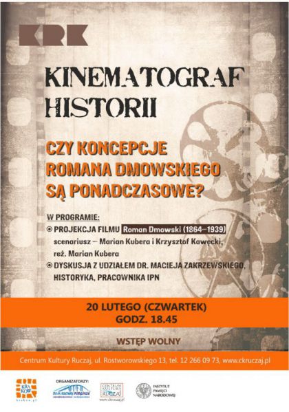 Zapraszamy na kolejne spotkanie z cyklu Kinematograf Historii. W programie: projekcja filmu "Roman Dmowski 1864-1939" (scenariusz: Marian Kubera i Krzysztof Kawęcki, reżyseria: Marian Kubera) oraz dyskusja z udziałem dr. Macieja Zakrzewskiego, historyka i pracownika IPN.