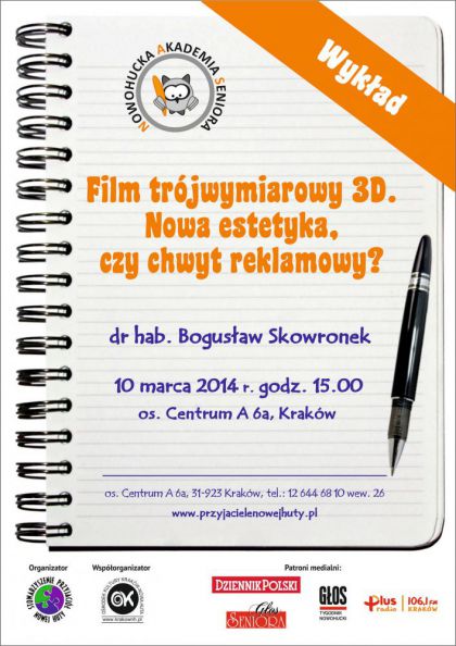 W trakcie prelekcji Kino 3D zostanie również porównane z tradycyjnym kinem. Dr hab. Bogusław Skowronek jest profesorem Uniwersytetu Pedagogicznego, filmoznawcą, krytykiem i popularyzatorem sztuki filmowej, badaczem współczesnej kultury audiowizualnej, autorem wielu publikacji naukowych poświęconych filmowi, mediom, kulturze popularnej oraz edukacji filmowej.