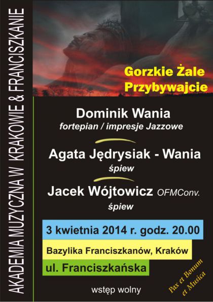 W czwartek 3 kwietnia o godzinie 20:00 w Bazylice Franciszkanów w Krakowie (ul. Franciszkańska 2) odbędzie się kolejne wydarzenie liturgiczno-koncertowe, realizowane w ramach tegorocznego cyklu „Pax et Bonum et Musica". „Gorzkie żale” w wersji jazzowej zaprezentują: Dominik Wania – fortepian, Agata Jędrysiak-Wania – śpiew oraz Jacek Wójtowicz OFMConv. – śpiew. Organizatorami koncertu są Akademia Muzyczna w Krakowie wraz z Klasztorem Franciszkanów. Wstęp na koncert wolny.