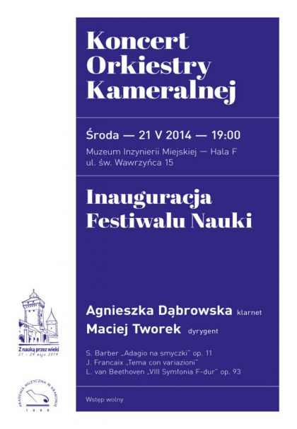 Wystąpią Orkiestra Kameralna Akademii Muzycznej w Krakowie pod dyrekcją Macieja Tworka. Jako solistka wystąpi klarnecistka Agnieszka Dąbrowska, studentka pierwszego roku studiów drugiego stopnia w klasie prof. Andrzeja Godka oraz dr. Piotra Lato. Na program koncertu złożą się utwory: słynne Adagio na smyczki Samuela Barbera, Tema con variazioni (wersja na klarnet i orkiestrę smyczkową) Jeana René Désiré Françaixa oraz VIII Symfonia F-dur op. 93 Ludwiga van Beethovena.