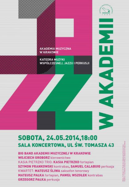 W sobotę 24 maja o godz. 18:00 w Sali koncertowej przy ul. św. Tomasza 43 wystąpi Big Band Akademii Muzycznej pod kierownictwem Wojciecha Groborza oraz Kasia Pietrzko Trio w składzie: Kasia Pietrzko - fortepian, Szymon Frankowski – kontrabas, Samuel Calabuig – perkusjab Grzegorz Pałka - perkusja i Kwartet w składzie: Mateusz Śliwa - saksofon tenorowy, Mateusz Pałka – fortepian oraz Paweł Wszołek - kontrabas.