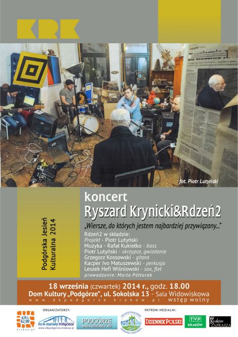 Jeden z najważniejszych twórców współczesnej polskiej poezji - Ryszard Krynicki - swoje zycie i działnośc zwiażał z krakowskim Podgórze. Nie moze wiec zabraknac obecnosci jego poezji podczas jublieuszowej edycji festiwalu. Przy akompaniamencie zespołu Rdzeń2 odczyta on swoje wiersze, do których wykazuje największe przywiązanie. Muzyczna stronę projektu – inspiracji poetą - stworzył Piotr Lutyński, artysta sztuk plastcznych, muzyk, którego prace znajduja sie w kolekcji m.in. Muzeum Narodowego w Krakowie.