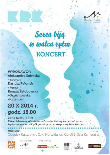 Koncert odbędzie się 20 października 2014 r., o godz. 18.00 w Sali Kameralnej Ośrodka Kultury im. C. K. Norwida, os. Górali 5. Bilety w cenie 10 zł będą dostępne na tydzień przed wydarzeniem w sekretariacie Ośrodka Kultury lub na pół godziny przed koncertem. Serdecznie zapraszamy.