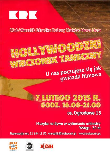 Poczuj się jak prawdziwa gwiazda! Zapraszamy 7 lutego 2015 r. w godz. 16.00-21.00 do Klubu Wersalik Ośrodka Kultury Kraków-Nowa Huta (os. Ogrodowe 15) na wieczorek taneczny w hollywoodzkim stylu przy muzyce granej na żywo. W programie między innymi: przejście po czerwonym dywanie, lampka szampana na przywitanie, pozowanie na ściance, towarzystwo celebrytów oraz konkursy o tematyce filmowej. W przerwach przewidziana muzyka filmowa.