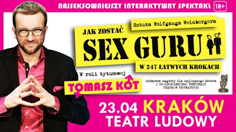 „Jak zostać Sex Guru” – adaptacja sztuki znakomitego austriackiego komika, Wolfganga Weinbergera, w reżyserii Gabriela Gietzky’ego to rozpustnie śmieszne interaktywne przedstawienie dla dorosłych, w którym Tomasz Kot będzie naszym przewodnikiem po seksualnym labiryncie. Aktor w komediowy, pikantny, ale zdystansowany sposób przedstawi widzom wiele praktycznych porad i wskazówek jak urozmaicić ich życie erotyczne. Sex Guru pomoże także odpowiedzieć na pytania, których wcześniej nie śmieliśmy zadać, a które od zawsze nurtowały ludzkość: Czego tak naprawdę pragną kobiety? Jak często powinienem/powinnam uprawiać seks? Czy mężczyźni naprawdę wiedzą gdzie jest słynny punkt „G”?