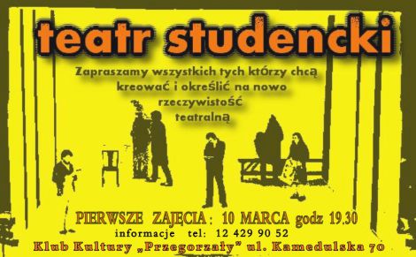 ZAPRASZAMY WSZYSTKICH CHĘTNYCH MAJĄCYCH 18 LAT I WIĘCEJ DO UCZESTNICZENIA W ZAJĘCIACH TEATRU STUDENCKIEGO