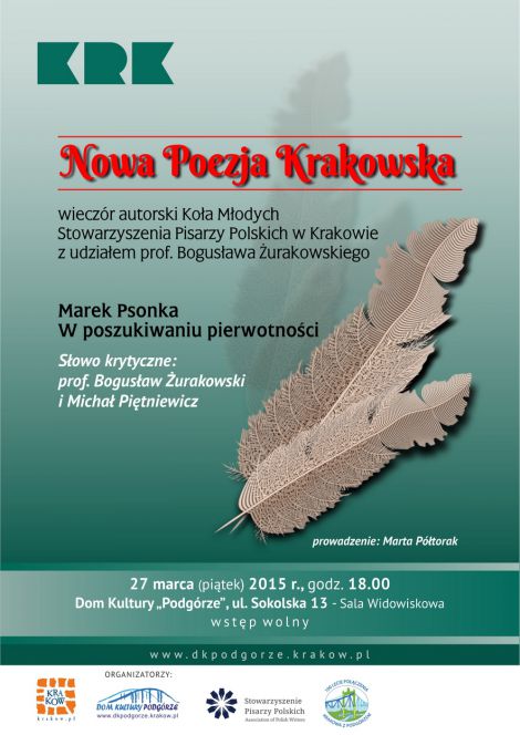 Zapraszamy na spotkanie z cyklu Nowa Poezja Krakowska, które ma na celu przedstawić poetów i przybliżyć ich twórczość skupionych przy Kole Młodych krakowskiego Stowarzyszenia Pisarzy Polskich w Krakowie.