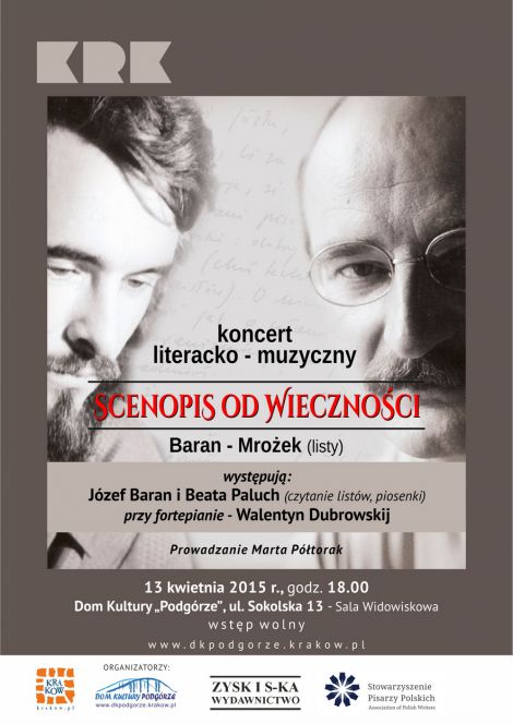 Zapraszamy na koncert Koncert literacko –muzyczny w wykonaniu Józefa Barana i Beaty Paluch. W czasie spotkania odczytane zostaną fragmenty listów Józefa Barana i Sławomira Mrożka.