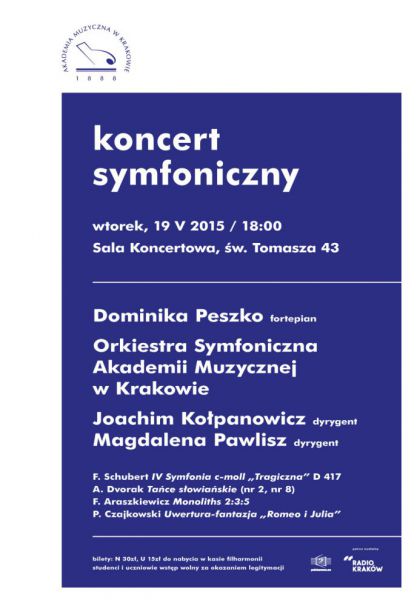 We wtorek 19 maja o godzinie 18:00 Akademia Muzyczna w Krakowie zaprasza na tradycyjny koncert dyplomantów, studentów klas dyrygentury, który odbędzie się w Sali koncertowej Akademii Muzycznej w Krakowie. Akademicką Orkiestrę Symfoniczną poprowadzą: Joachim Kołpanowicz z klasy dyrygentury prof. Tadeusza Strugały oraz Magdalena Pawlisz z klasy prof. dra hab. Rafała Jacka Delekty. Solistką koncertu będzie młoda pianistka, doktorantka Akademii Muzycznej w Krakowie Dominika Peszko.
