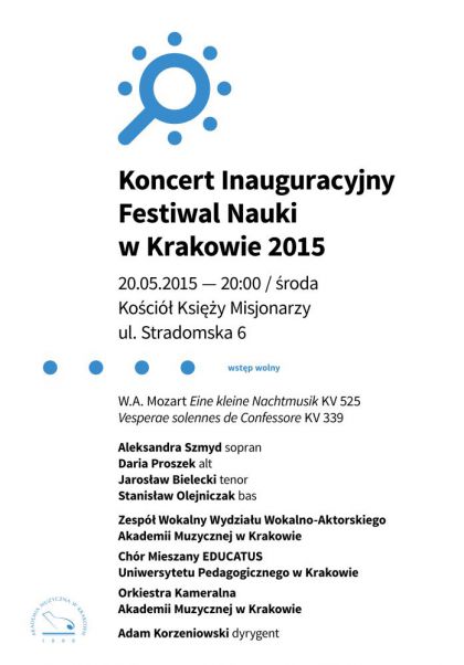 Zawsze chętnie słuchana i powszechnie rozpoznawalna muzyka W.A. Mozarta wypełni wnętrze kościoła księży Misjonarzy przy ul. Stradomskiej 6 w środę 20 maja o godzinie 20:00. W ramach XV Festiwalu Nauki podczas koncertu inauguracyjnego wystąpią: Aleksandra Szmyd – sopran, Daria Proszek – alt, Jarosław Bielecki – tenor, Stanisław Olejniczak – bas, Zespół Wokalny Wydziału Wokalno-Aktorskiego, Chór Mieszany EDUCATUS Uniwersytetu Pedagogicznego w Krakowie oraz Orkiestra Kameralna Akademii Muzycznej w Krakowie. Całość poprowadzi Adam Korzeniowski. Wstęp wolny.