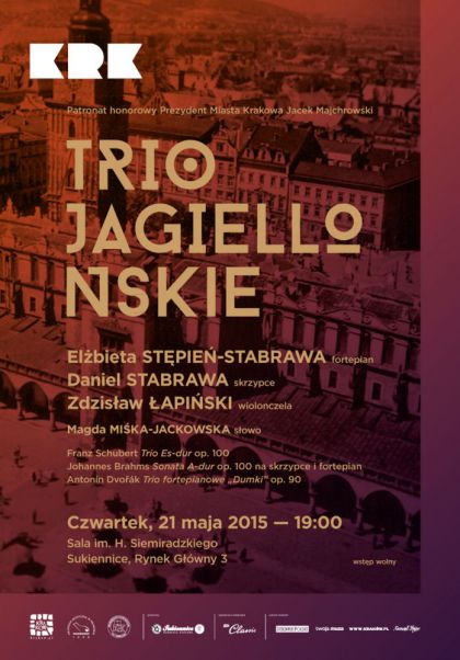 W czwartek 21 maja o godzinie 19:00 we wnętrzu Galerii Sztuki Polskiej XIX w. w Sukiennicach zabrzmi muzyka kameralna F. Schubert, J. Brahmsa oraz A. Dvořák w mistrzowskim wykonaniu Tria Jagiellońskiego w składzie: Elżbieta Stępień-Stabrawa – fortepian, Daniel Stabrawa – skrzypce oraz Zdzisław Łapiński – wiolonczela. Koncert poprowadzi Magda Miśka-Jackowska. Wstęp wolny za okazaniem zaproszenia, które można odebrać w Biurze Promocji Artystycznej Akademii Muzycznej w Krakowie w godzinach 8-15. Ilość zaproszeń ograniczona.