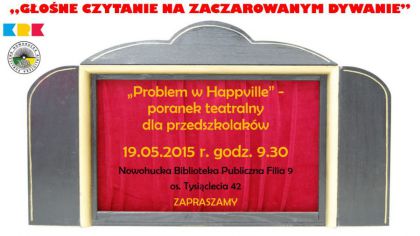 „Problemy w Happville”. Poranek z teatrzykiem Kamishibai dla przedszkolaków. W cyklu: Głośne czytanie na zaczarowanym dywanie Biblioteka zaprasza na zajęcia edukacyjno-literackie dzieci w wieku przedszkolnym. Uczestnicy spotkania poznają historię teatrzyku kamishibai, wezmą też udział w niezwykłym obrazkowym spektaklu, podczas którego poznają przygody pana Peabody’ego z miasteczka Happville.