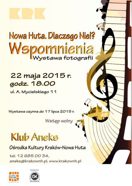 Zapraszamy do obejrzenia wystawy fotograficznej podsumowującej 40 wydarzeń i 10 lat cyklu Nowa Huta. Dlaczego Nie?! w Klubie Aneks Ośrodka Kultury Kraków-Nowa Huta (ul. A. Mycielskiego 11). W jednym miejscu zgromadzone zostały druki promocyjne, a także zdjęcia prezentujące większość z 38 koncertów oraz dwóch pokazów specjalnych filmów. Doświadczenie czterdziestu wydarzeń cyklu pokazuje potrzebę i ogromne zainteresowanie tego typu spotkaniami kulturalnymi. Wystawę można oglądać od 22 maja do 17 lipca.