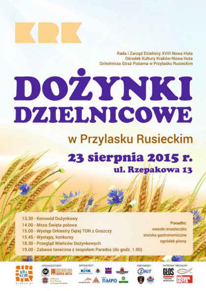 Tradycją są obchodzone w całym kraju, końcem sierpnia każdego roku święta plonów. Podtrzymując ten zwyczaj, Rada i Zarząd Dzielnicy XVIII Nowa Huta, Ośrodek Kultury Kraków-Nowa Huta oraz Ochotnicza Straż Pożarna w Przylasku Rusieckim zapraszają na tegoroczne Dożynki Dzielnicowe, które odbędą się w niedzielę 23 sierpnia w Przylasku Rusieckim (ul. Rzepakowa 13). W nowohuckich osiedlach wciąż wielu mieszkańców posiada swoje własne pola i zajmuje się rolnictwem, a organizowane święto plonów jest ukłonem w ich stronę za trud, który wkładają w swoją pracę.