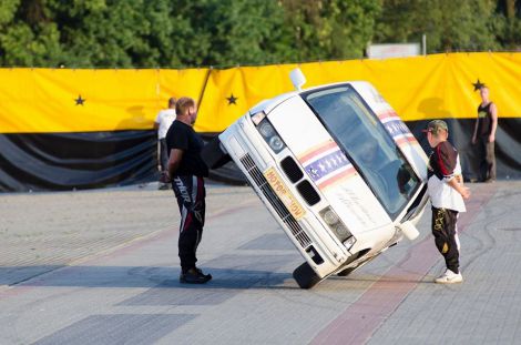 * przebijanie głową płonącej ściany, będąc jednocześnie na masce BMW;