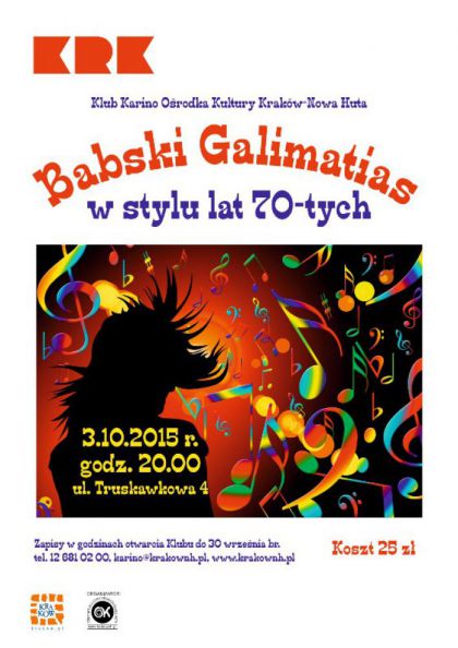 Kolejna impreza dla kobiet z cyklu Babski Galimatias organizowana przez Klub Karino Ośrodka Kultury Kraków-Nowa Huta (os. Chałupki, ul. Truskawkowa 4). Tym razem zapraszamy na zabawę w stylu lat 70-tych. Podczas imprezy odbędzie się pokaz mody oraz konkurs na najciekawszy strój z tamtych lat. Nie zabraknie ciekawych konkursów i tanecznych popisów. Zapraszamy 3 października o 20.00.