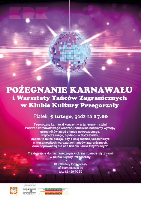 Tegoroczny karnawał kończymy w tanecznym stylu! Podczas karnawałowego wieczoru podziwiać będziemy występy uczestników zajęć z tańca nowoczesnego, współczesnego, hip-hopu a także baletu. Będzie to także okazja, aby z całą rodziną uczestniczyć w niesamowitych warsztatach tańców zagranicznych, które poprowadzą dla nas Ksenia i Julia Onyszkanycz. Przybywajcie do nas tanecznym krokiem i bawcie się z nami w Klubie Kultury Przegorzały!