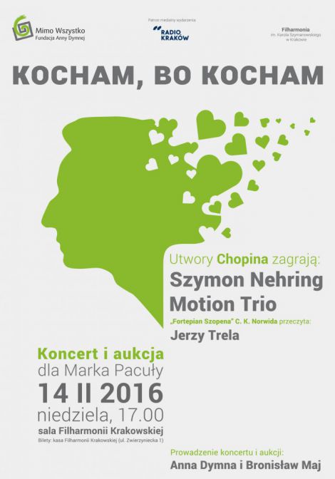 Fundacja Anny Dymnej „Mimo Wszystko” i Filharmonia Krakowska, już po raz ósmy, organizują walentynkowy koncert charytatywny na rzecz chorych oraz niepełnosprawnych artystów znajdujących się w trudnej sytuacji materialnej. W tym roku zbierane będą pieniądze na rehabilitację Marka Pacuły, który – po wypadku w 2012 r. – przeszedł operację krwiaka mózgu, zapadł w śpiączkę i do dzisiaj wymaga 24-godzinnej opieki swojej małżonki Barbary Natkaniec-Pacuły. Koncertowi, którego tytuł brzmi: „Kocham, bo kocham”, towarzyszyć będzie aukcja piór, zegarków oraz Magicznych Przedmiotów ofiarowanych przez znane postacie naszego życia publicznego (m.in. Prezydenta Andrzeja Dudę, Jerzego Owsiaka, kard. Stanisława Dziwisza). Licytację poprowadzą Anna Dymna i Bronisław Maj.