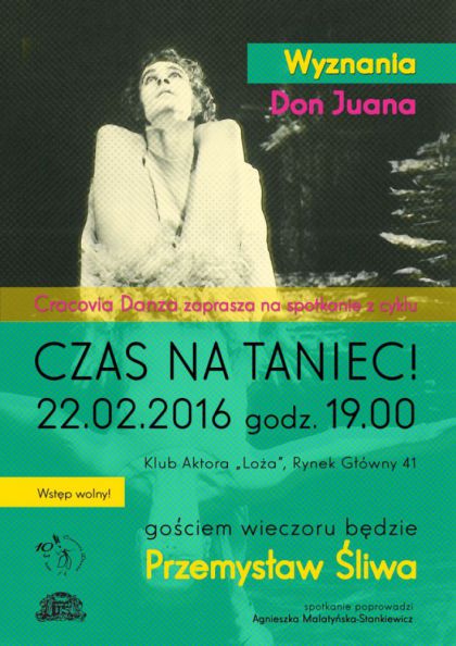 Przemysław Śliwa, solista i pierwszy tancerz najpierw Państwowej Opery w Poznaniu a także przez 13 lat Polskiego Teatru Tańca Conrada Drzewieckiego, choreograf współpracujący z licznymi teatrami muzycznymi i dramatycznymi w całym kraju oraz pedagog baletu, będzie gościem najbliższego spotkania CZAS NA TANIEC!. Wieczór, który odbędzie się w poniedziałek 22 lutego o godz. 19 w Klubie Aktora „Loża” (Kraków, Rynek Główny 41) otrzymał tytuł "Wyznania Don Juana".