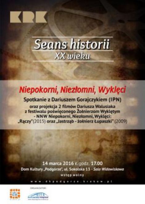 Seans historii XX wieku - Niepokorni, Niezłomni, Wyklęci - spotkanie z Dariuszem Gorajczykiem (IPN) oraz projekcja 2 filmów Dariusza Walusiaka z festiwalu poświęconego Żołnierzom Wyklętym - NNW Niepokorni, Niezłomni, Wyklęci : "Rączy”(2015) oraz "Jastrząb - żołnierz Łupaszki" (2009)