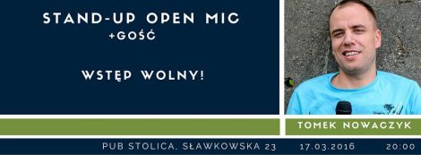 Tomek Nowaczyk – obiecujący (na przykład zwrot pożyczonych pieniędzy) stand-upper. Zwycięzca konkursu One Ryj Show podczas XIX Rybnickiej Jesieni Kabaretowej 2014. Członek kabaretu Czesuaf, nałogowy biegacz (kilkanaście ukończonych maratonów i żyje!), autor wierszy dla dzieci. Jako stand-upper tworzy raczej nie dla dzieci. Ma wielu fanów, z tym że nie wszyscy już o tym wiedzą. Występował na wielu Stolica zaprasza na imprezę typu stand-up! W pierwszej części odbędzie się open mic. Każdy, kto ma ochotę, wchodzi na scenę, aby opowiedzieć kawałek stand-upu, historię z życia, anegdotę, bardzo dziwny, zabawny sen (ale jednak nalepiej kawałek stand-upu).
