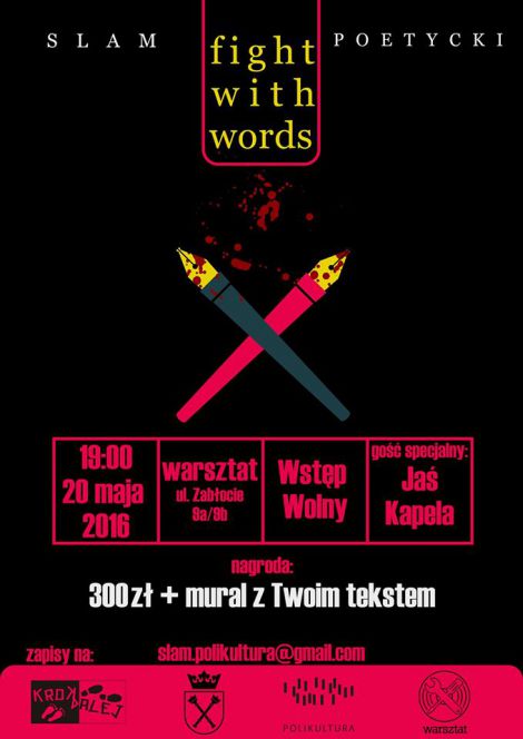 Będzie to literackie spotkanie, gdzie poezja współczesna połączy się ze sztuką performatywną. Podczas wydarzenia poeci mają 3 minuty, aby zaprezentować swój utwór. W walce na słowa może wziąć udział każdy, zarówno amator, jak i doświadczony literat. Gościem specjalnym będzie Jan Kapela, zwycięzca pierwszego w historii polskiego slamu. Fragment zwycięskiego tekstu zostanie uwieczniony w formie muralu na ścianie Warsztatu na Zabłociu.