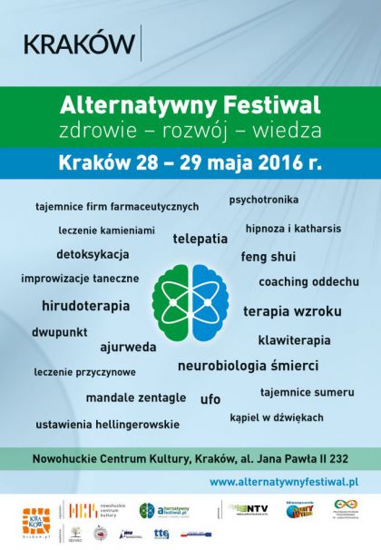 Program Festiwalu podzielony jest na trzy główne bloki tematyczne: zdrowie, rozwój własny i wiedza alternatywna. W tych przenikających się obszarach, w dniach 28-29 maja 2016 roku w Krakowie w Nowohuckim Centrum Kultury podczas drugiej edycji Alternatywnego Festiwalu odbędą się spotkania, prelekcje, wystąpienia, targi, warsztaty, koncert, pokazy i wiele innych intelektualnych atrakcji.