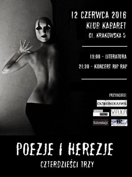 Zapraszamy Państwa na czterdzieste trzecie Poezje i herezje. Zobaczymy się po raz ostatni przed wakacjami, a ugości nas, po raz kolejny, Klub Kabaret. Tym razem zaczniemy o godzinie 19:00, bo dochodzą nas słuchy, że kolidujemy z meczem, przez który części z Pańswa bylibyśmy mniej po drodze.