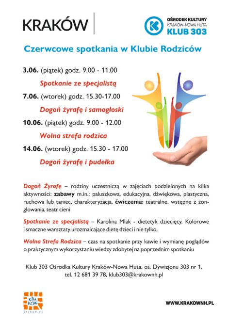 Klub 303 Ośrodka Kultury Kraków-Nowa Huta (os. Dywizjonu 303 nr 1) serdecznie zaprasza na kolejne spotkanie w ramach Klubu Rodziców. Wolna strefa rodzica jest to czas na miłe spędzenie przedpołudnia, odbędzie się ona 10 czerwca o godz. 9:00. Podczas spotkań i warsztatów dla rodziców, dzieciom zapewnimy profesjonalną opiekę pod okiem animatora-opiekuna. W Wolnej strefie rodzice znajdą również coś do picia i drobne przekąski. Będzie to czas na rozmowę i złapanie oddechu pomiędzy codziennymi obowiązkami „zapracowanego” Rodzica.