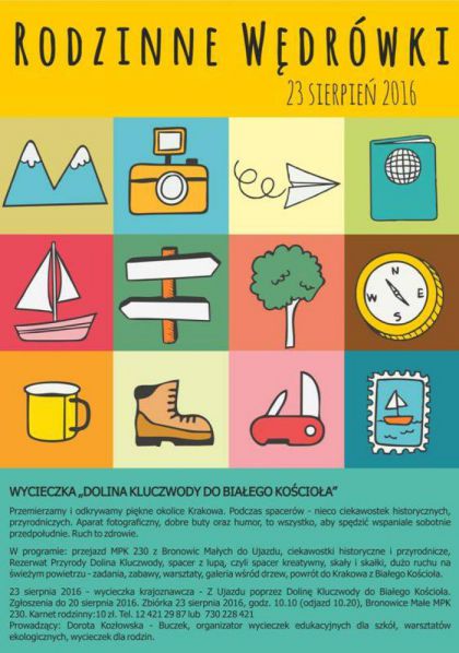 W programie: przejazd MPK 230 z Bronowic Małych do Ujazdu, ciekawostki historyczne i przyrodnicze, Rezerwat Przyrody Dolina Kluczwody, spacer z lupą, czyli spacer kreatywny, skały i skałki, dużo ruchu na świeżym powietrzu - zadania, zabawy, warsztaty, galeria wśród drzew, powrót do Krakowa z Białego Kościoła.