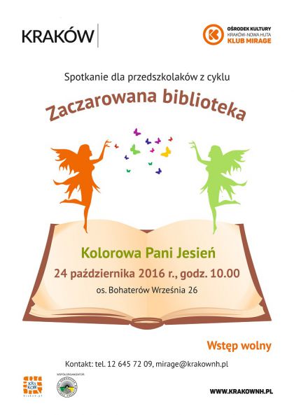 Klub Mirage Ośrodka Kultury Kraków-Nowa Huta Zaprasza na zajęcia edukacyjne dla maluchów w wieku 2-4 lat w ramach cyklu Zaczarowana biblioteka, które odbędą się 24 października o godz. 10:00. Zajęcia odbywają się raz w miesiącu w Klubie Mirage na os. Bohaterów Września 26 i prowadzone są przez pracowników Nowohuckiej Biblioteki Publicznej. Podczas wizyty do tajemniczego świata książek dzieci będą miały okazje wysłuchać ciekawych baśni, bajek i opowiadań a wraz z ich bohaterami poznawać otaczający ich świat. Każde spotkanie poświęcone jest innemu tematowi. W październiku tematem będzie Pani Jesień. Pani Jesień, która jak mówi piosenka kolorowe liście niesie, kosz kasztanów, jarzębinę z tego Pani Jesień słynie. No i jeszcze Pani Jesień wiatr i deszczyk z sobą niesie, ale my się nie boimy i z jesienią się bawimy. I tak dokładnie jak w piosence będzie na spotkaniu dzieci z Panią Jesienią w Klubie Mirage.
