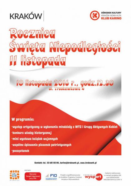 W ramach projektu Krakowski Inkubator Kultury II Klub Karino Ośrodka Kultury Kraków-Nowa Huta (ul. Truskawkowa 4) zaprasza 10 listopada o godz. 12.30 na spotkanie upamiętniające odzyskanie przez Polskę Niepodległości – Święto 11 listopada. W wydarzenie zaangażowana została społeczność lokalna osiedla Chałupki, Młodzież niepełnosprawna WTZ oraz seniorki i grupa Aktywne Kobiety działające przy Klubie Karino, które wystąpią podczas imprezy z programem okolicznościowym. Będzie również gość specjalny, który przybliży wszystkim zebranym wydarzenia z tamtego okresu. Odbędzie się konkurs wiedzy historycznej, mini wystawa książek o tematyce wojennej oraz wspólne śpiewanie pieśni patriotycznych. Projekt współfinansowany ze środków Programu Fundusz Inicjatyw Obywatelskich.