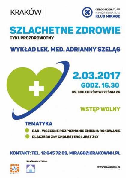 Klub Mirage Ośrodka Kultury Kraków-Nowa Huta zaprasza na nowy cykl wykładów prozdrowotnych pt. Szlachetne zdrowie, który rozpocznie się 2 marca 2017 r. o godz. 16:00 na os. Bohaterów Września 26. Lek. med. Adrianna Szeląg poruszy na pierwszym spotkaniu dwa tematy: Rak – wczesne rozpoznanie zmienia rokowanie oraz Dlaczego zły cholesterol jest zły? Głównym celem warsztatów będzie przekazanie praktycznych informacji, w czym tkwi istota schorzenia, jak się przed nim uchronić i jak monitorować swój stan zdrowia.