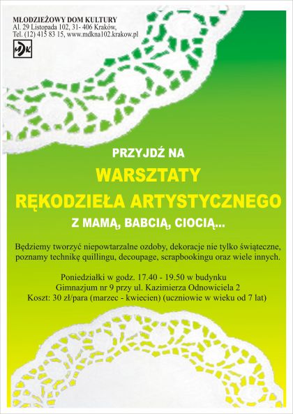 PRZYJDŹ NA WARSZTATY RĘKODZIEŁA ARTYSTYCZNEGO Z MAMĄ, BABCIĄ, CIOCIĄ...